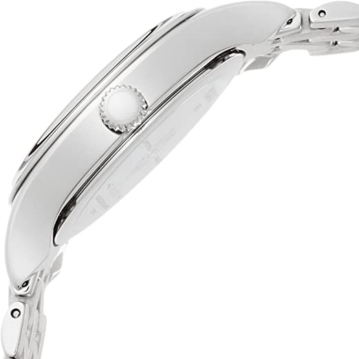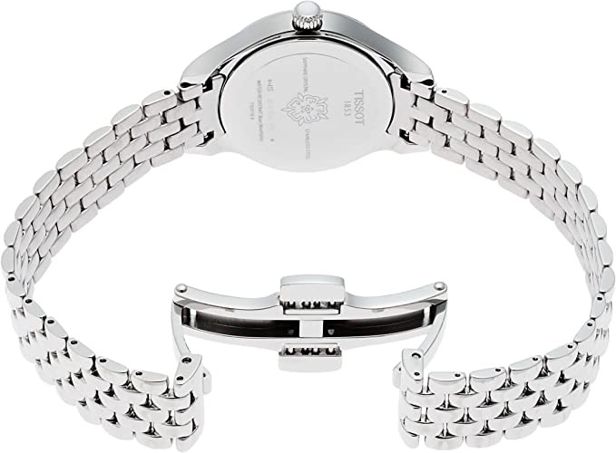 The white dial is enhanced by silver hands. Silver stainless steel case with silver stainless steel strap. Quartz movement. Water resistant to 30 meters/100 feet. Fixed bezel. Scratch resistant sapphire crystal. Solid caseback. Deploy using button buckles. Pull/push crown. Case dimensions 27mm x 7.73mm. With 12mm x length. Tissot T103.110.11.033.00 Bella Ora watch.